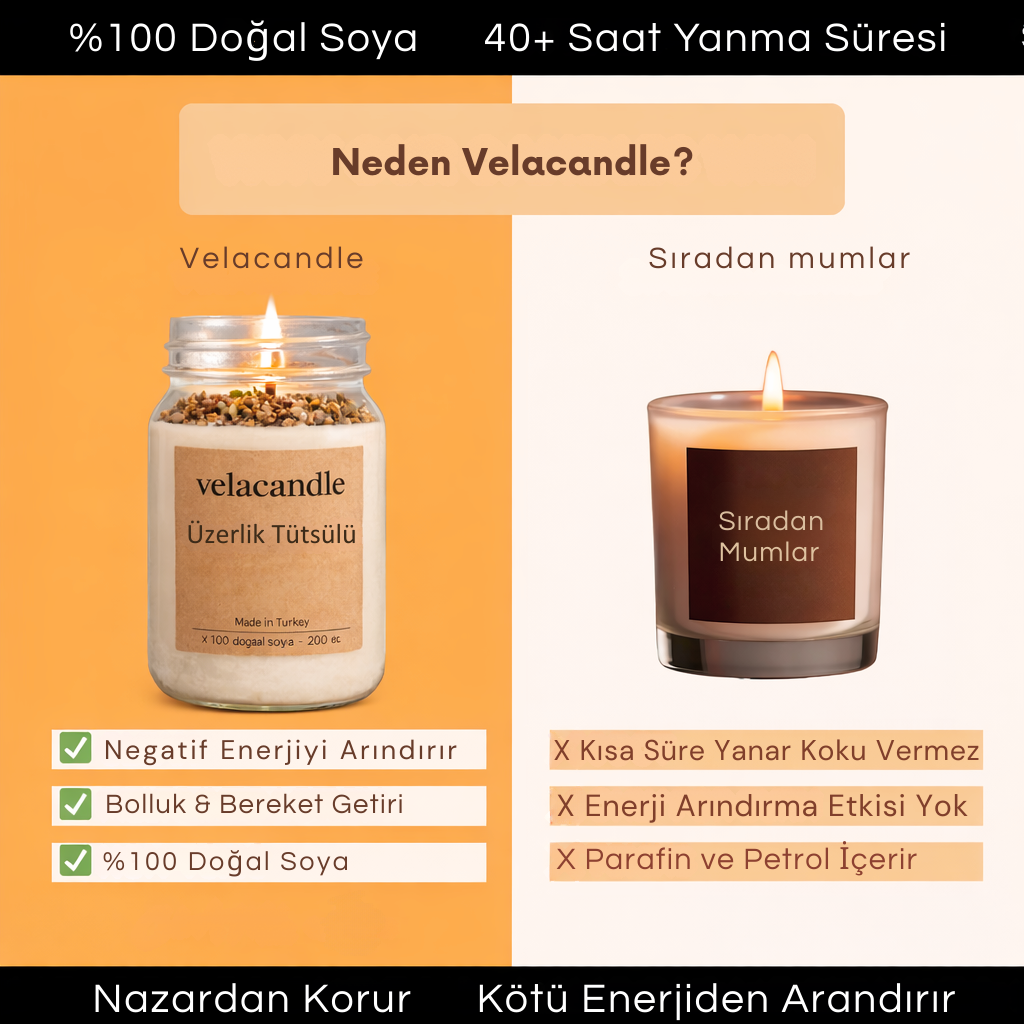 Bu mum, üzerlik otu ve ada çayının geleneksel etkilerini modern ve güvenli bir kullanım sunan %100 doğal soya mumu ile birleştirir. Negatif enerjiden arınma, ortamda denge ve huzur hissi oluşturma amacıyla özel olarak hazırlanmıştır. Günlük kullanımda rahatsız edici duman veya ağır koku oluşturmaz.